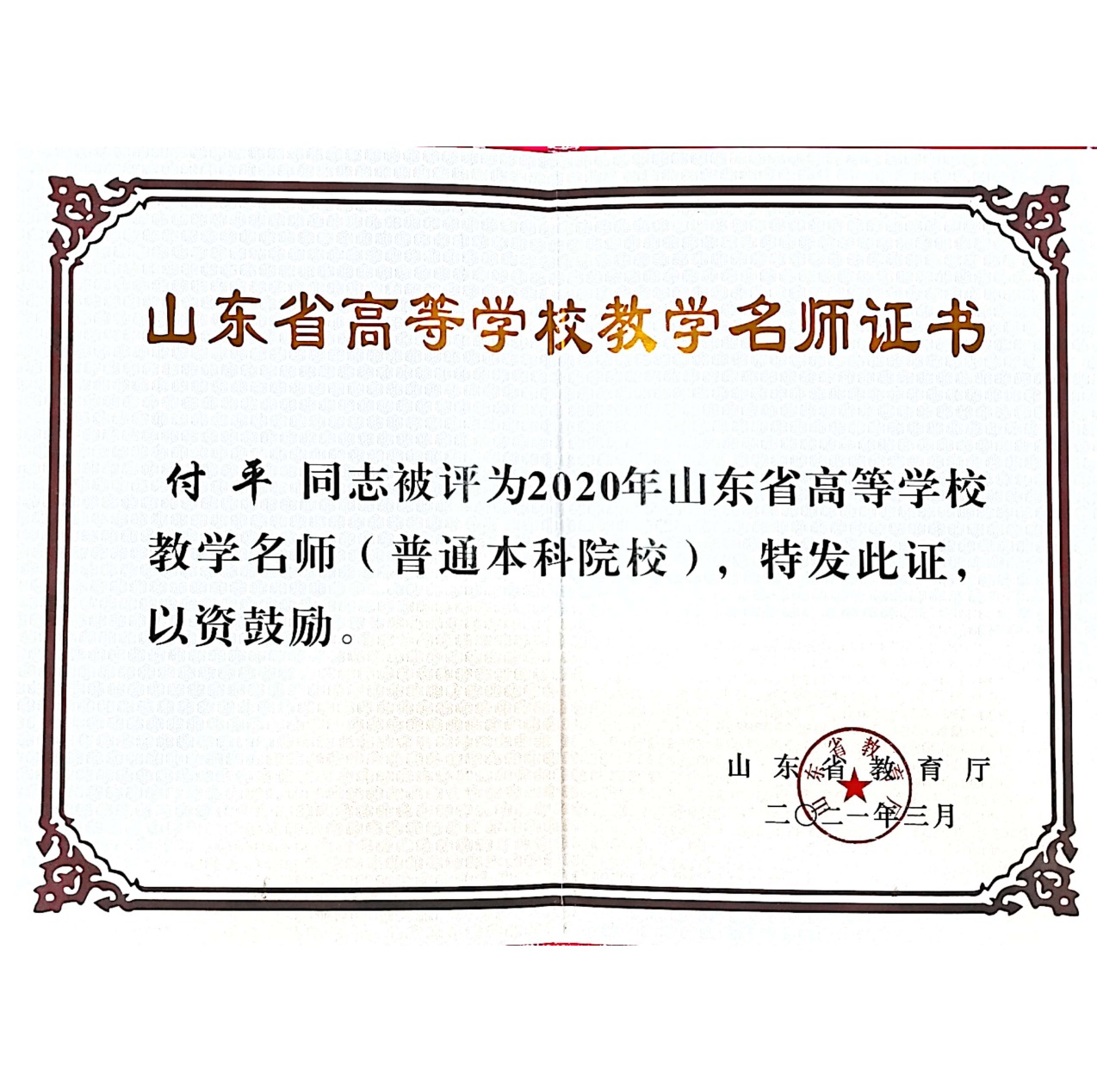 山东省教育厅发布了《关于公布2020年山东省高等学校教学名师名单的通知》(鲁教师字〔2021〕2号),我校4名教师获评2020年度山东省高等学校教学名师,机电学院付平老师位列其中,至此,我院省教学名师数量再创新高。