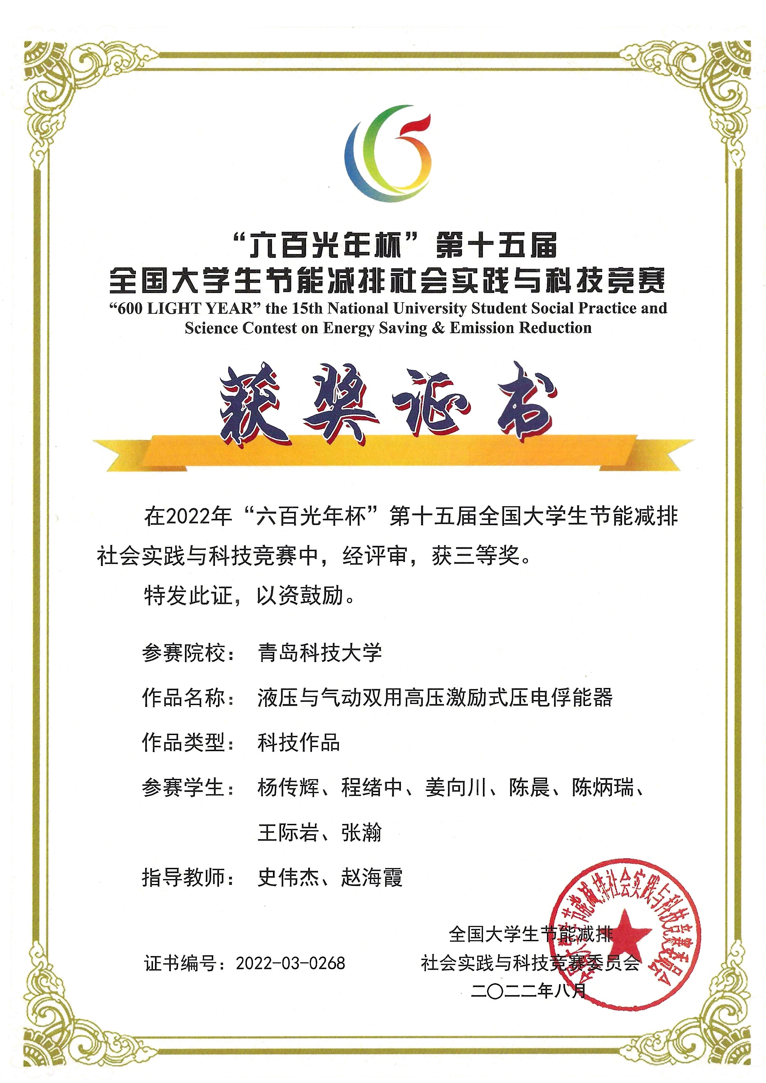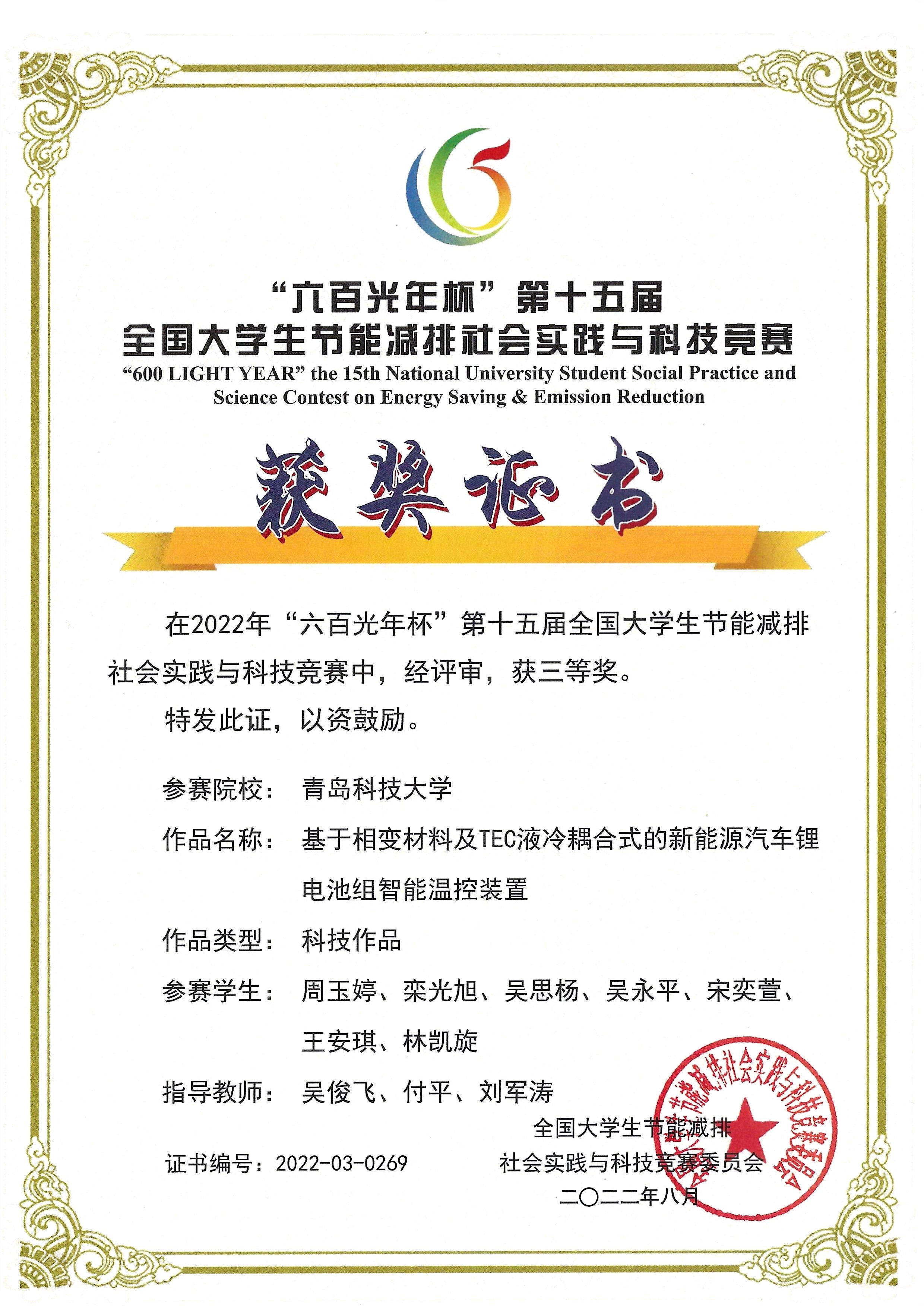 第十五届全国大学生节能减排社会实践与科技竞赛国家级三等奖2项