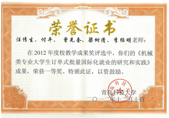 青岛科技大学教学成果奖一等奖——机械类专业大学生订单式批量国际化就业的研究与实践