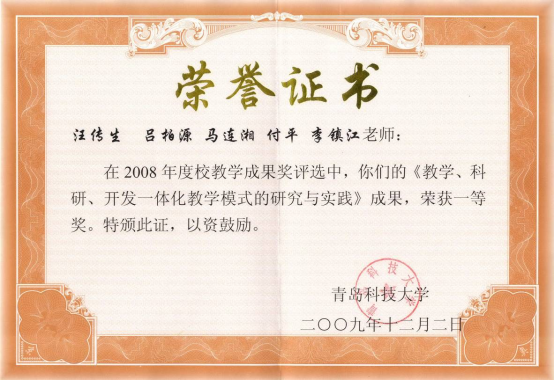 青岛科技大学教学成果奖一等奖——教学、科研、开发一体化的教学模式的研究与实践